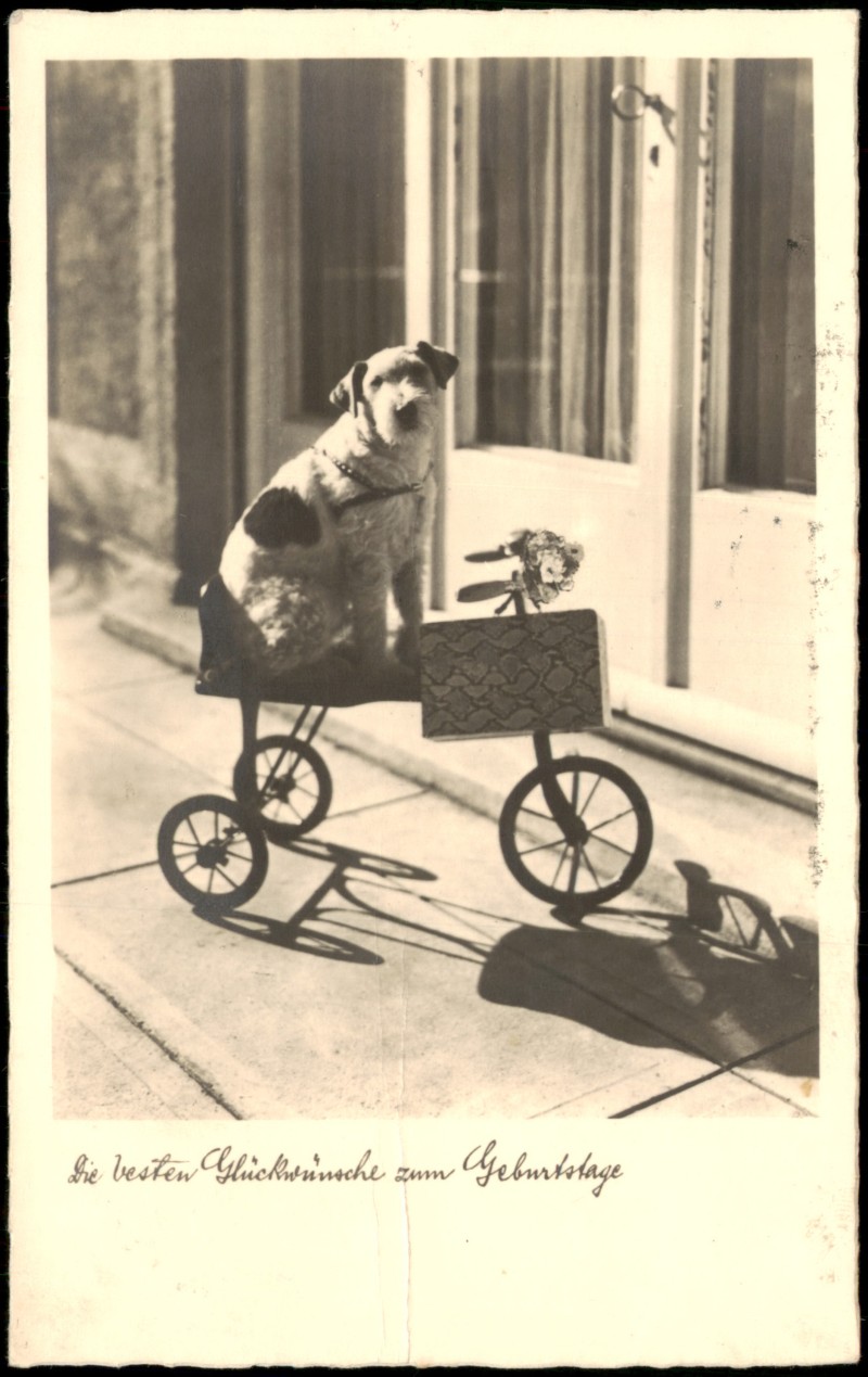 Ansichtskarte: Geburtstag Birthday Fotokunst Hund auf Dreirad