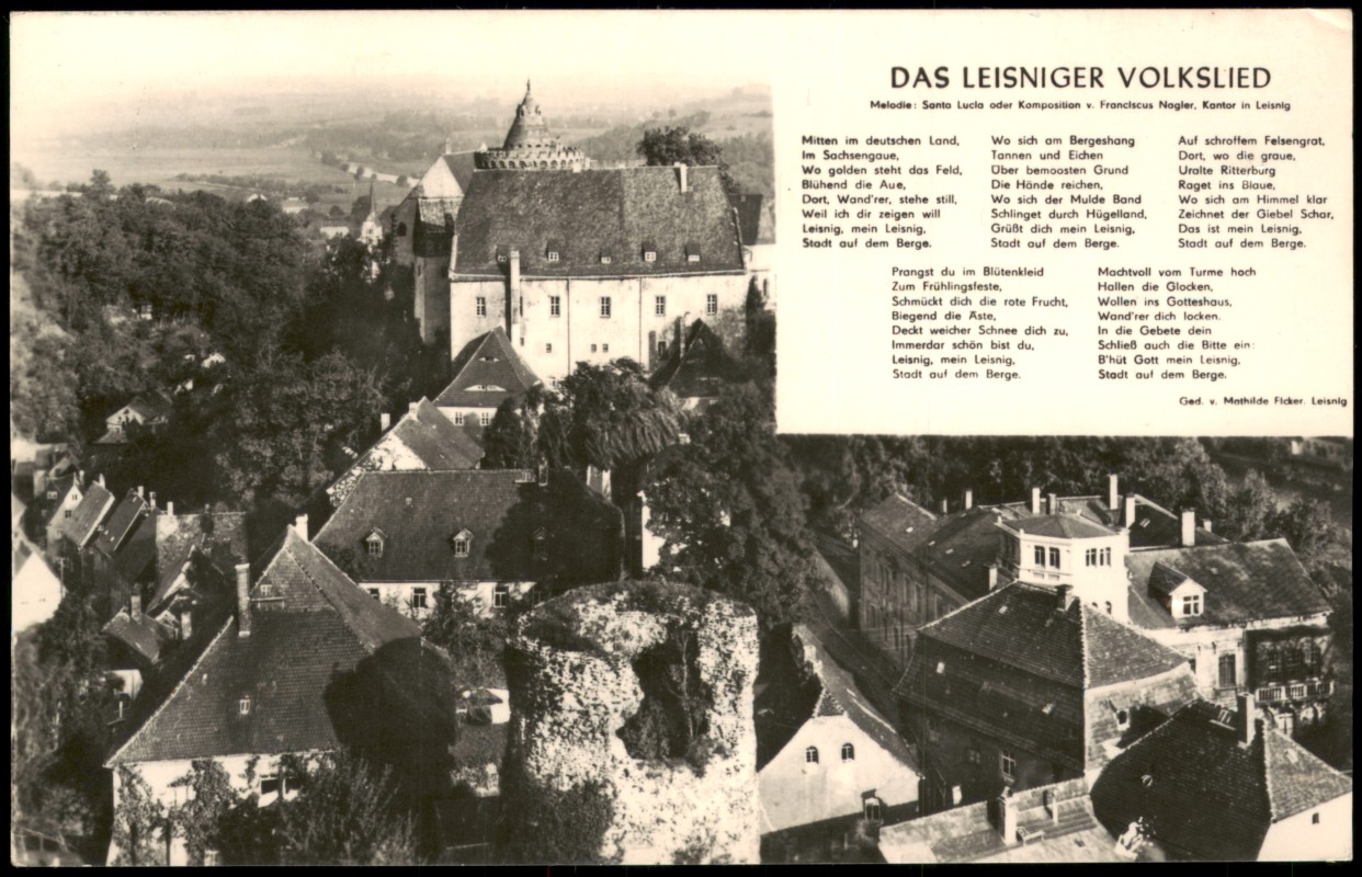 Foto Karte: Panorama-Ansicht DDR AK mit Leisniger Volkslied Text - Leisnig