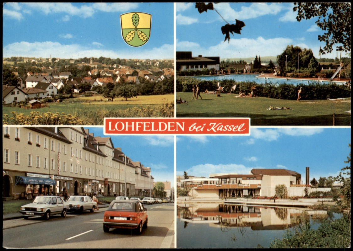 Foto Karte: Mehrbildkarte u.a. mit Schwimmbad, Autos vor Geschäften u.a. VW Golf Cabrio - Lohfelden (b. Kassel)