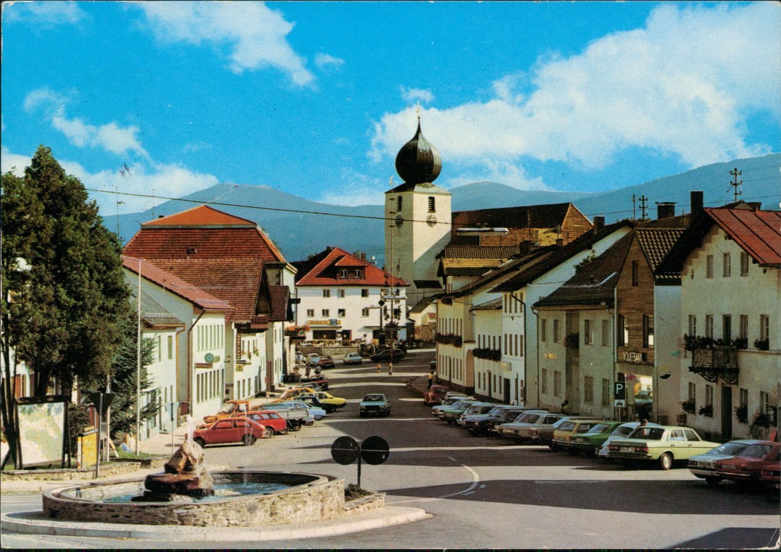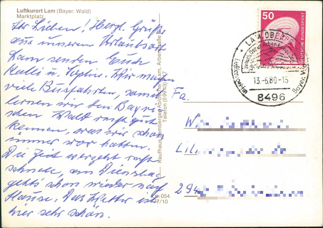 - Farbfotografie des Marktplatzes im Luftkurort Lam im Bayerischen Wald. Die Ansicht zeigt die zentrale Straße mit zeitgenössischen Pkw der 1970er Jahre und im Hintergrund die katholische Pfarrkirche St. Ulrich mit ihrem markanten Zwiebelturm. Herausgegeben vom Kaufhaus Lemberger Ablössner, Lam.