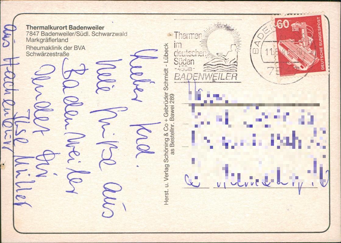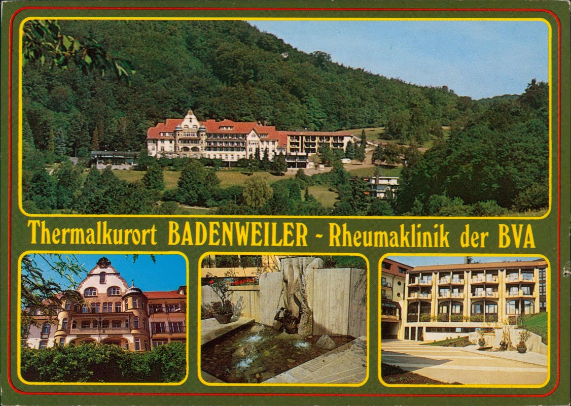 - Mehrbildkarte der Rheumaklinik der BVA (Bundesversicherungsanstalt für Angestellte) im Thermalkurort Badenweiler. Die Karte zeigt vier Ansichten: Eine Panoramaaufnahme der Klinik am bewaldeten Hang, eine Detailansicht des historischen Gebäudeteils, eine moderne Gebäudeansicht sowie eine Brunnenanlage im Außenbereich. Erschienen im Verlag Schöning & Co + Gebrüder Schmidt, Lübeck.