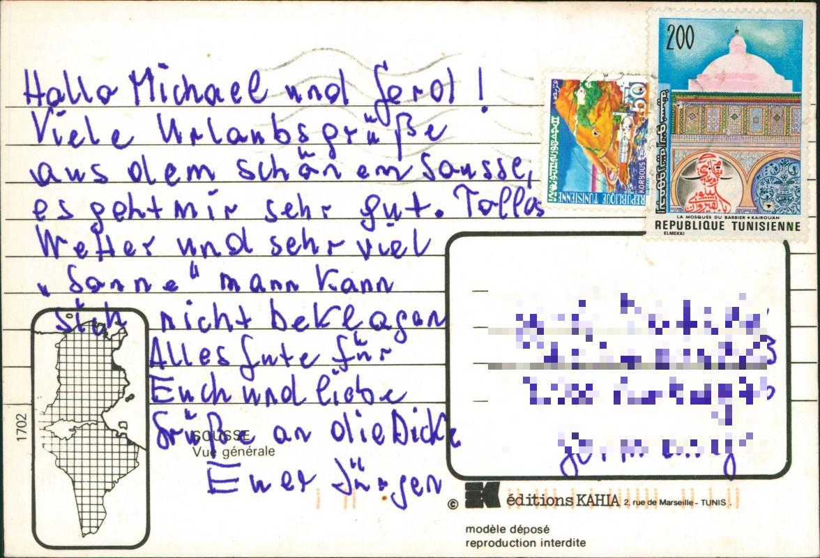 - Farbige Panorama-Ansichtskarte (Vue générale) der tunesischen Stadt Sousse. Die Abbildung zeigt den Hafenbereich mit Schiffen, die dichte Stadtbebauung mit modernen Hochhäusern sowie den weitläufigen Strandabschnitt im Hintergrund. Rückseitig findet sich das Logo des Verlags Editions Kahia aus Tunis sowie der Name des Künstlers/Designers El Mekki im Bereich der Briefmarkenzone.