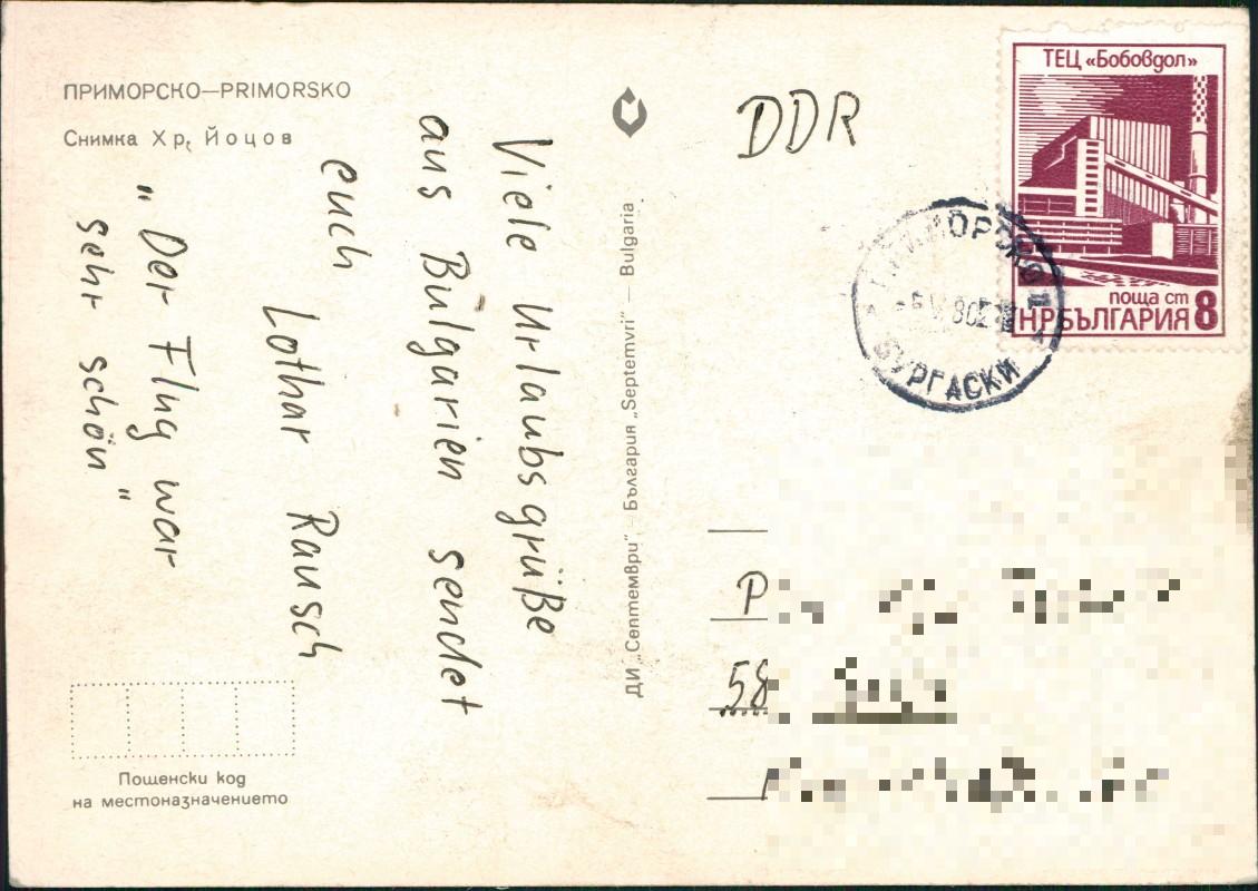 - Farbfotografie eines belebten Badestrandes in Primorsko am Schwarzen Meer. Die Aufnahme zeigt zahlreiche Urlauber beim Sonnenbaden, bunte Sonnenschirme und einen orangefarbenen Windschutz im Sand. Im Hintergrund erstreckt sich das blaue Meer bis zur gegenüberliegenden, bewaldeten Küstenlinie. Foto von Hr. Yotsov (Хр. Йоцов). Herausgegeben vom Verlag Septemvri, Bulgarien.