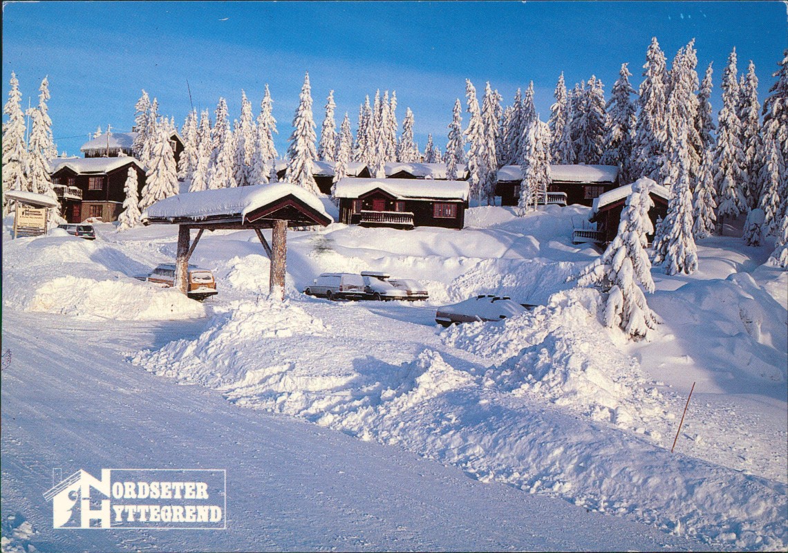 - Farbfotografie der Nordseter Hyttegrend in Norwegen auf einer Höhe von 850 m.o.h. Das Motiv zeigt mehrere traditionelle dunkle Holzhütten mit schneebedeckten Dächern in einer tief verschneiten Winterlandschaft unter blauem Himmel. Foto von Normann, veröffentlicht im Normanns Kunstforlag A/S, Oslo. Gedruckt in Norwegen.