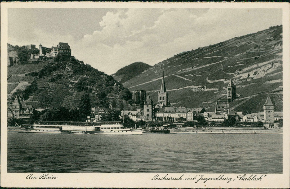 Foto Karte: Rhein Dampfer Schiff passiert Jugendherberge Burg Stahleck - Bacharach