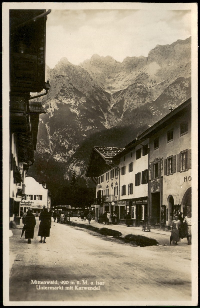 Foto Karte: Untermarkt Straßen-Ansicht mit Personen, Geschäften - Mittenwald