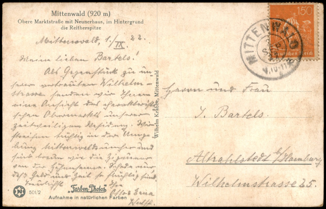 Ansichtskarte: Obere Marktstraße mit Neunerhaus, im Hintergrund die Reitherspitze - Mittenwald