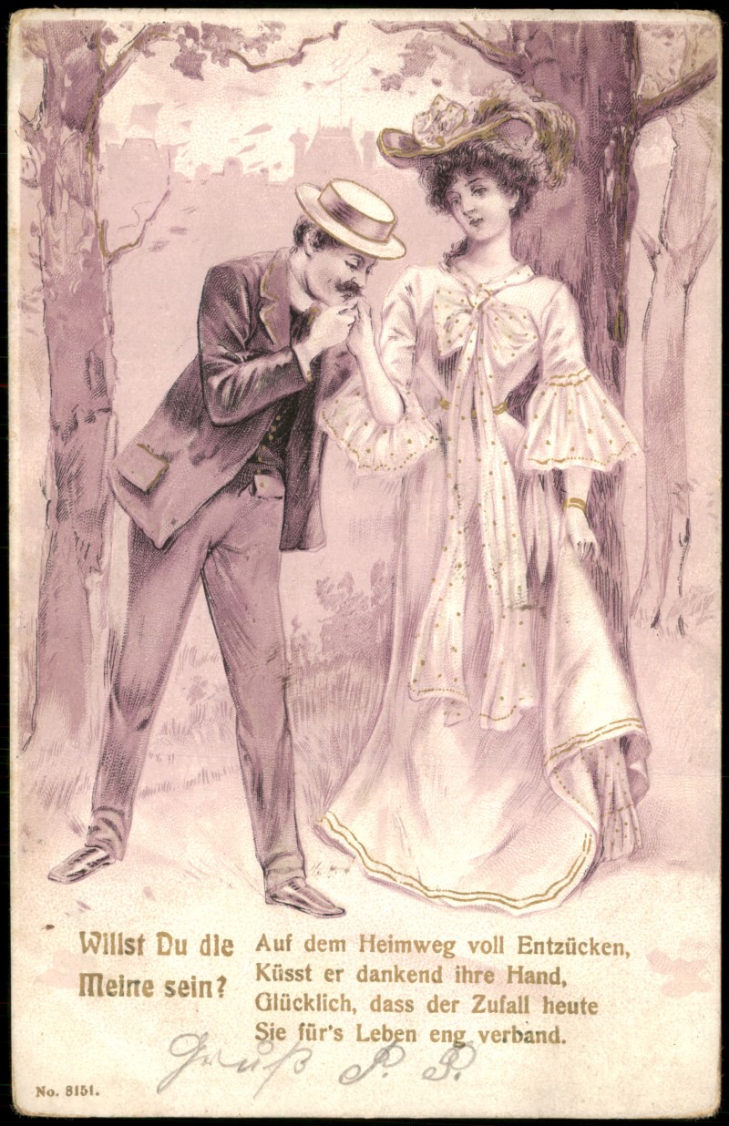 - Künstlerkarte Liebe Liebespaare Mann hält um die Hand der Frau an