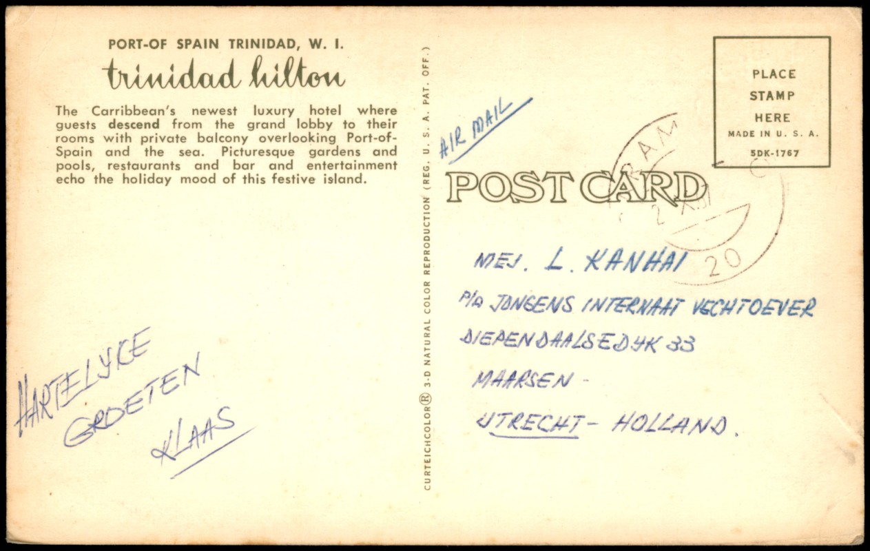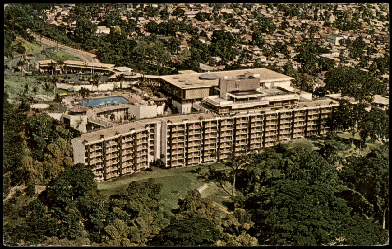 - Farbige Ansichtskarte mit einer Luftaufnahme des Trinidad Hilton Hotels in Port of Spain, Trinidad. Das Hotel ist für seine Architektur bekannt, bei der die Gäste von der Lobby in die tiefer gelegenen Zimmer mit privaten Balkonen hinabsteigen. Die Karte zeigt die Hotelanlage eingebettet in eine grüne Hügellandschaft mit Blick auf die Stadt und das Meer. Gedruckt in den USA von Curteichcolor.