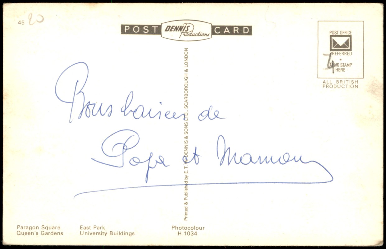 - Farbige Mehrbild-Postkarte (Photocolour) mit vier Ansichten aus Kingston upon Hull: Der moderne Paragon Square mit Busverkehr, Ruderboote im East Park, die Queen's Gardens mit Springbrunnen und Denkmal sowie Gebäude der Universität. Erschienen in der Serie 'Dennis Productions'.
