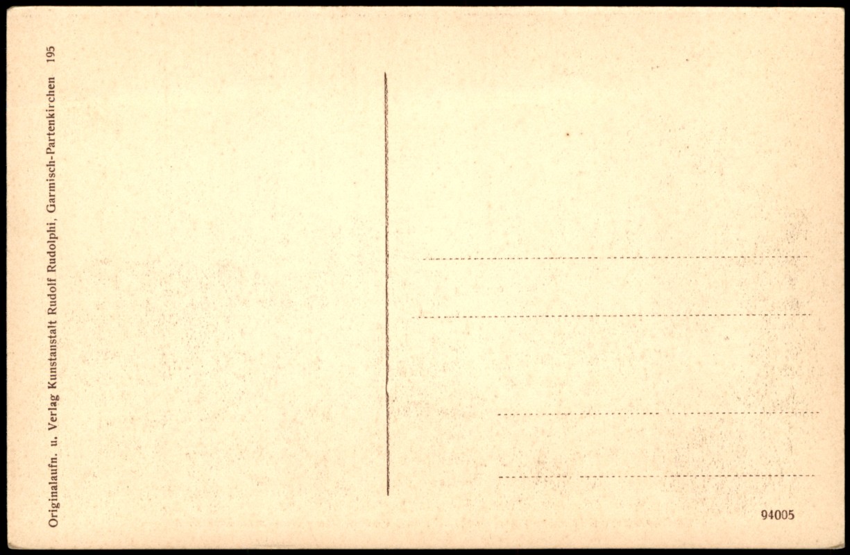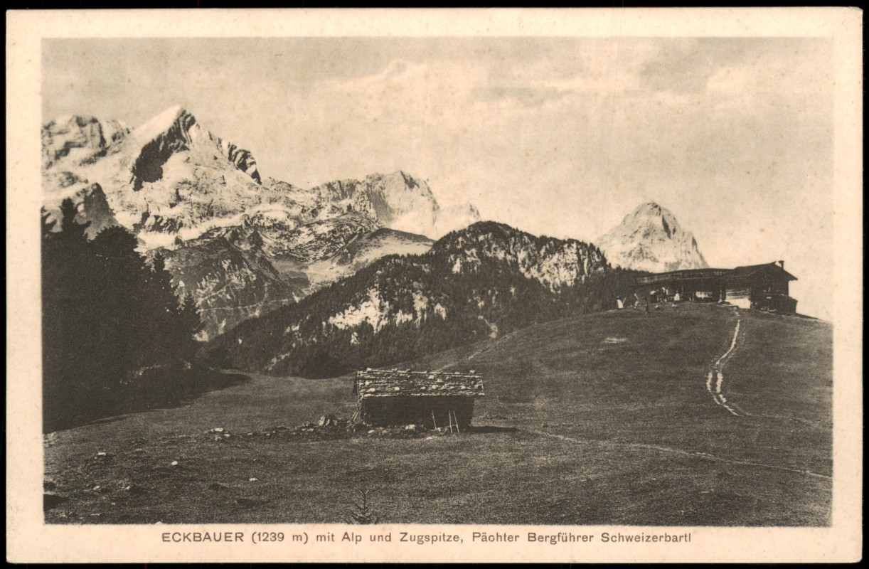 - Echtfoto-Postkarte (Originalaufnahme) mit einer Ansicht vom Eckbauer (1239 m) im Wettersteingebirge. Im Vordergrund ist eine Alp-Hütte zu sehen, im Hintergrund erhebt sich das Massiv der Zugspitze. Der Text auf der Vorderseite nennt zudem den Pächter Bergführer Schweizerbart. Erschienen im Verlag Kunstanstalt Rudolf Rudolphi, Garmisch-Partenkirchen.