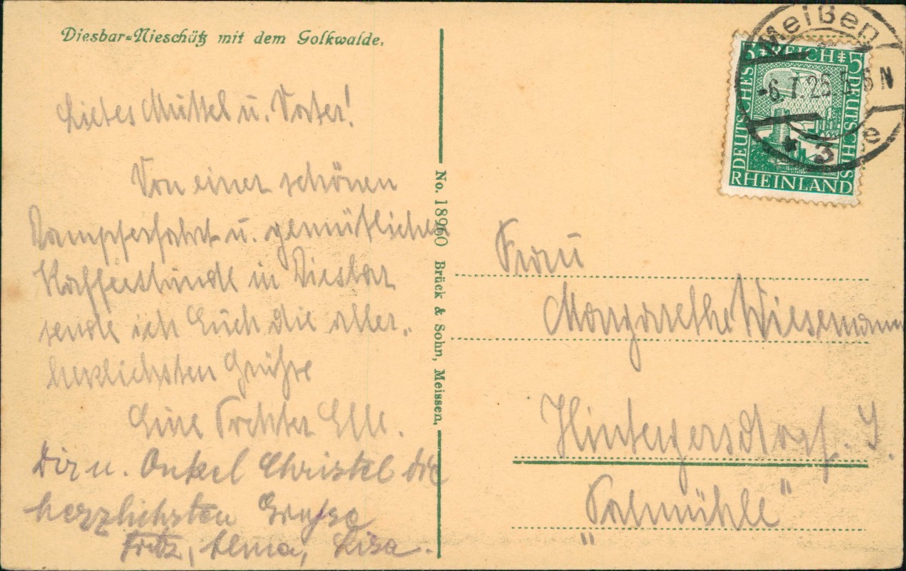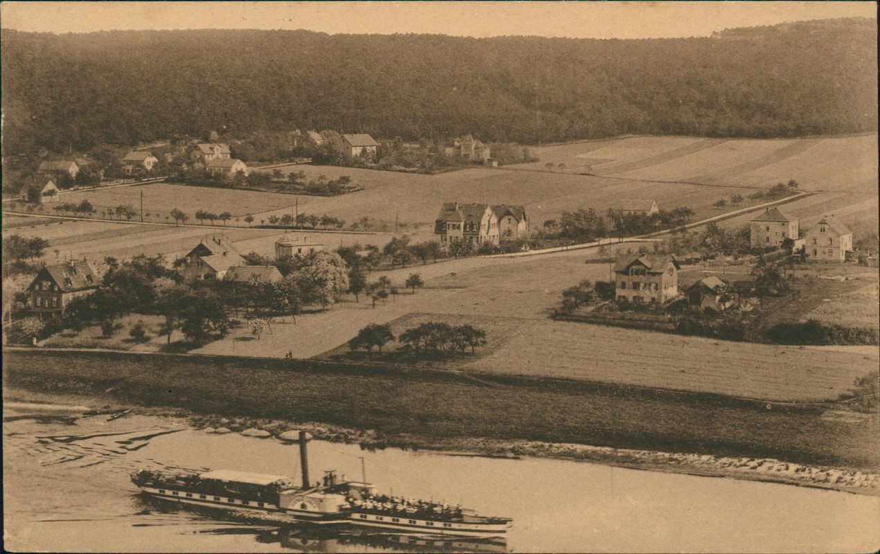 Ansichtskarte: Fernblick auf die Stadt - Dampfer - Diesbar (Elbe)-Diesbar-Seußlitz-Nünchritz (Elbe)