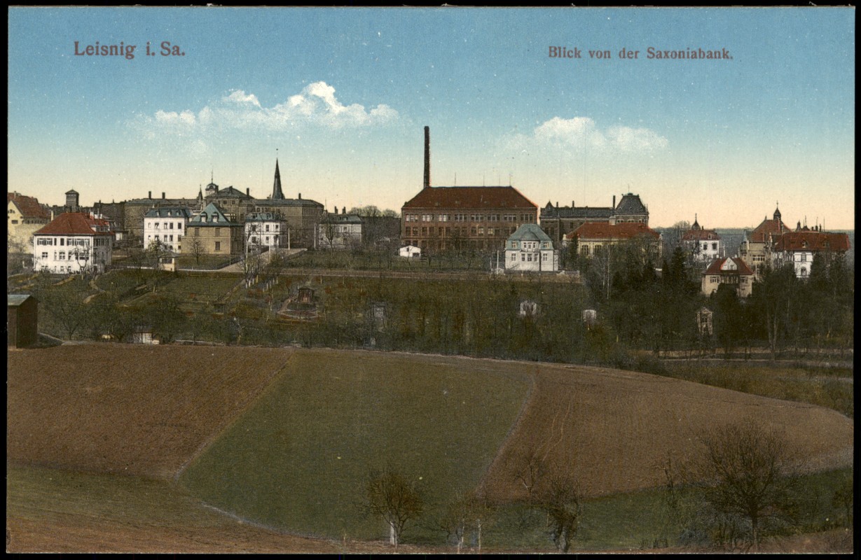 Ansichtskarte: Blick von der Saxoniabank. Stadt Fabrik - Leisnig