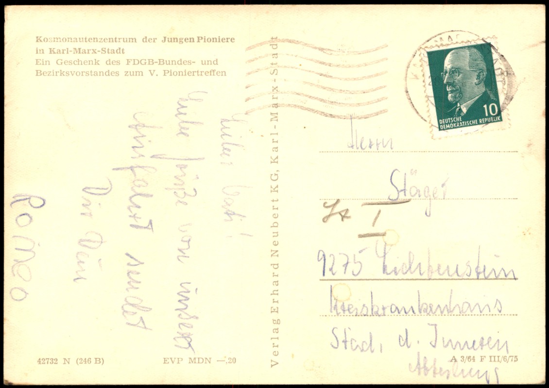 - Die Postkarte zeigt eine Szene am Kosmonautenzentrum der Jungen Pioniere in Karl-Marx-Stadt (heute Chemnitz). Im Vordergrund stehen zwei Kinder in silbernen Raumanzügen mit Helmen sowie zwei Junge Pioniere in Uniform, die einen Blumenstrauß halten. Im Hintergrund ist eine große Rakete mit der vertikalen Aufschrift 'V. PIONIERTREFFEN' neben einem Gitterturm zu sehen. Die Karte wurde als Geschenk des FDGB-Bundes- und Bezirksvorstandes zum V. Pioniertreffen herausgegeben.