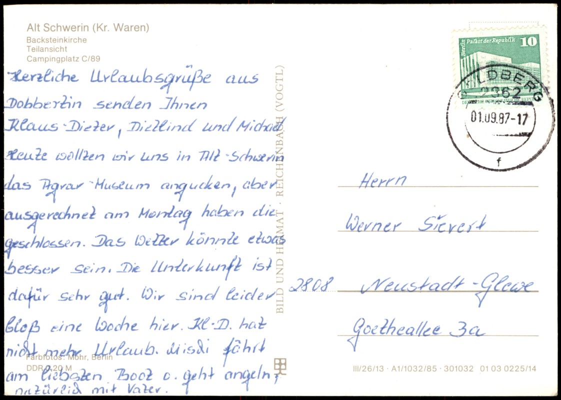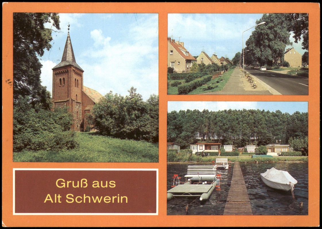 diese Karte können Sie hier kaufen:- Alt Schwerin DDR Mehrbild-AK mit Backsteinkirche u. Campingplatz C/89 1987/1985