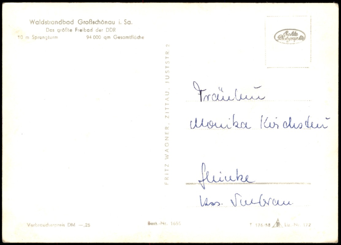 - Echte Photographie des Waldstrandbades in Großschönau i. Sa., welches laut Aufdruck als das größte Freibad der DDR galt. Die Ansicht zeigt Badegäste in Ruderbooten auf dem weitläufigen Gewässer, im Hintergrund ist der 10-m-Sprungturm sowie eine Hügelkette erkennbar. Die Karte nennt technische Daten wie 94.000 qm Gesamtfläche.