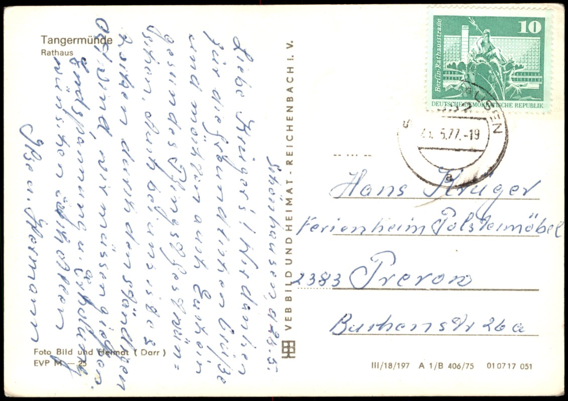 Foto Karte: Rathaus zur DDR-Zeit, Autos Motorräder davor - Tangermünde