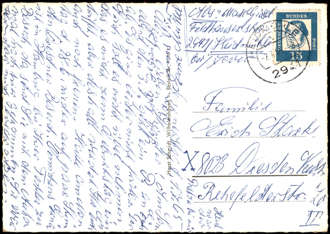 - Mehrbild-Postkarte von Heidmühle in Oldenburg (heute Ortsteil von Schortens). Die Karte zeigt verschiedene Motive: ein markantes Backsteingebäude, Straßenszenen, ein Freibad an einem See mit Badegästen und Steganlage, eine Außengastronomie sowie eine historische Galerieholländer-Windmühle.