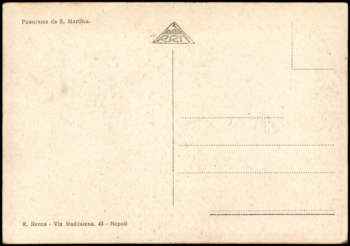 - Sepia-fotografische Panorama-Ansicht, aufgenommen vom Aussichtspunkt San Martino. Die Aufnahme zeigt die dichte städtische Bebauung, den Hafenbereich und den Golf. Im Hintergrund ist der Vulkan Vesuv mit einer aktiven Rauchwolke zu sehen. Druck durch R. Renza, Neapel.
