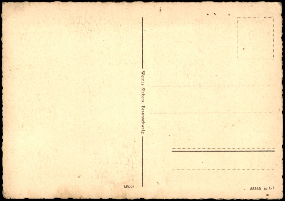 - Schwarz-Weiß-Fotografie des Braunschweiger Löwen im Burghof der Burg Dankwarderode. Die Aufnahme erfolgt perspektivisch durch die steinernen Arkadenbögen des Gebäudes. Im Hintergrund sind historische Fachwerkhäuser zu sehen. Die Karte hat einen gezackten Rand (Büttenrand).