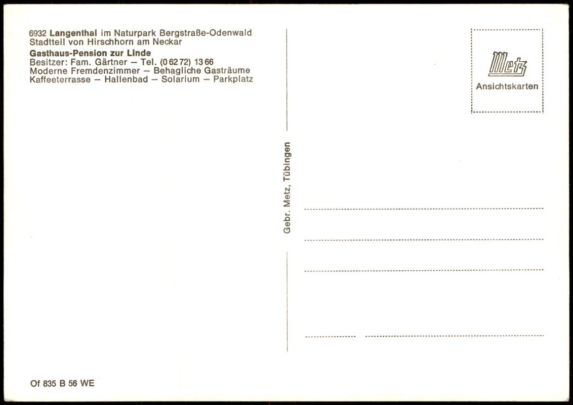 - Mehrbild-Ansichtskarte der Gasthaus-Pension Zur Linde in Langenthal, einem Stadtteil von Hirschhorn am Neckar im Naturpark Bergstraße-Odenwald. Die Karte zeigt vier Ansichten: die Außenansicht des Gebäudes, zwei Innenaufnahmen der behaglichen Gasträume sowie die Kaffeeterrasse mit Panoramablick. Als Besitzer wird die Familie Gärtner genannt. Die Karte bewirbt zudem moderne Fremdenzimmer, ein Hallenbad und ein Solarium.