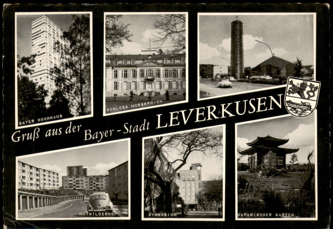 - Mehrbild-AK mit Bayer Hochhaus, SCHLOSS MORSBROICH, VW Käfer, Gymnasium uvm.