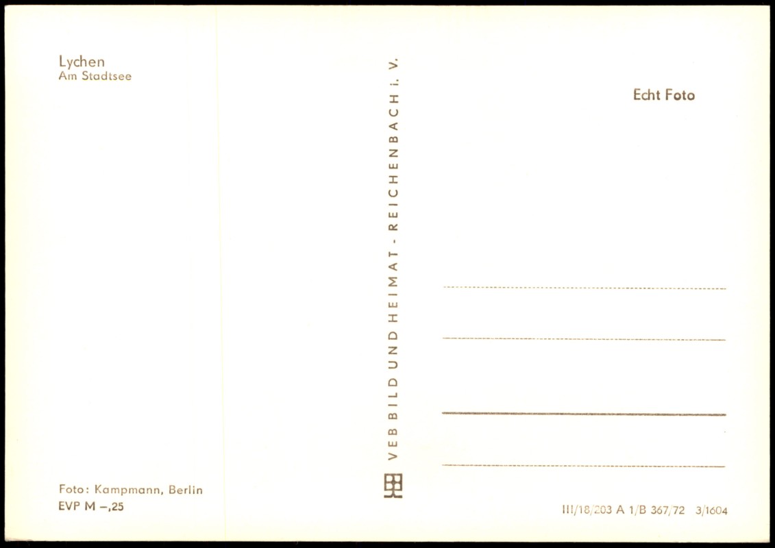 - Echt-Foto-Postkarte mit einer Ansicht von Lychen. Die Aufnahme zeigt den Blick über den Stadtsee auf die Silhouette der Stadt, die von der massiven Stadtpfarrkirche St. Johannes dominiert wird. Am Ufer und im Vordergrund ist dichter Baumbestand sichtbar. Die Karte wurde vom Fotografen Kampmann aus Berlin aufgenommen und im VEB Bild und Heimat Reichenbach i. V. verlegt. Der Preis ist mit EVP M -,25 angegeben.