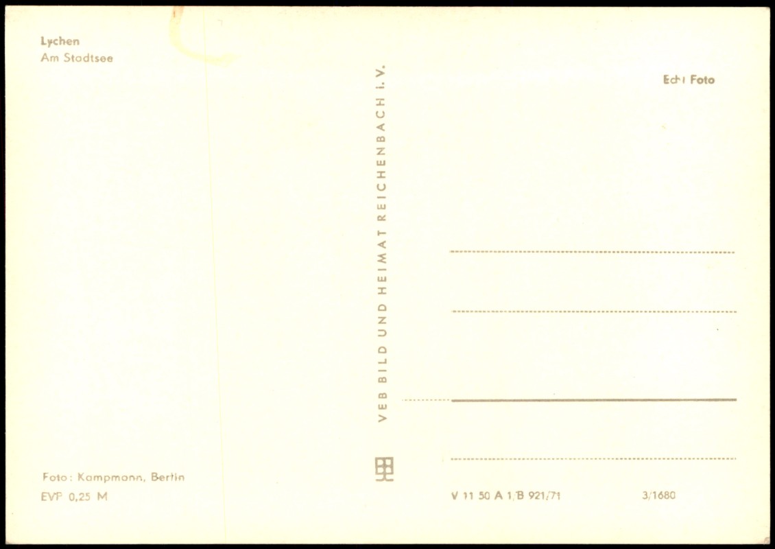 - Echtfoto-Ansichtskarte (Schwarz-Weiß) vom Stadtsee in Lychen. Das Bild zeigt eine hölzerne Fußgängerbrücke, die über einen Teil des Sees führt, sowie ein kleines Motorboot mit Personen auf dem Wasser. Im Hintergrund ist dichter Baumbestand zu sehen. Die Fotografie stammt von Kampmann, Berlin.