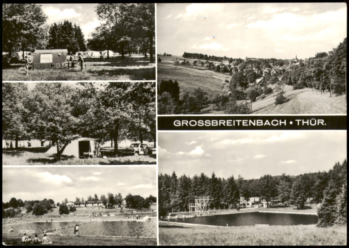 Foto Karte: DDR Mehrbild-AK mit Ortsansichten u.a. Freibad, Zeltplatz - Großbreitenbach