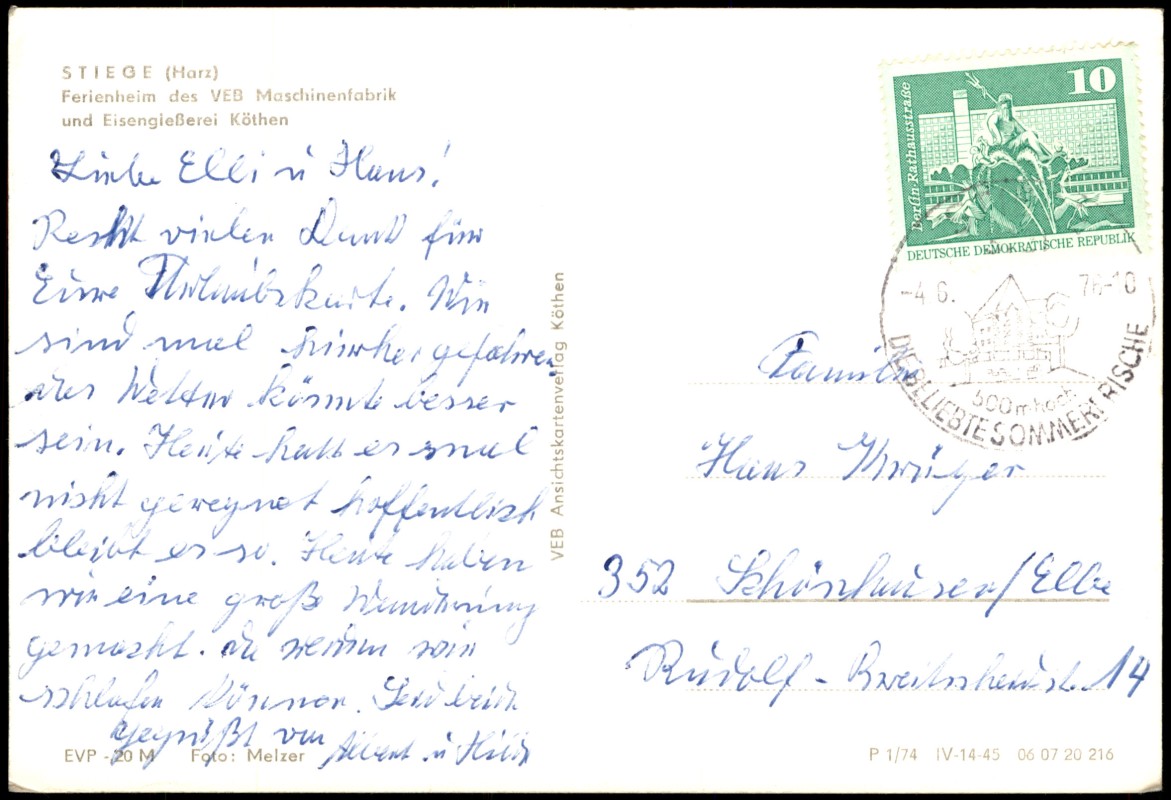 Ansichtskarte: Ferienheim des VEB Maschinenfabrik und Eisengießerei Köthen, Stiege (Harz) - Stiege Harz