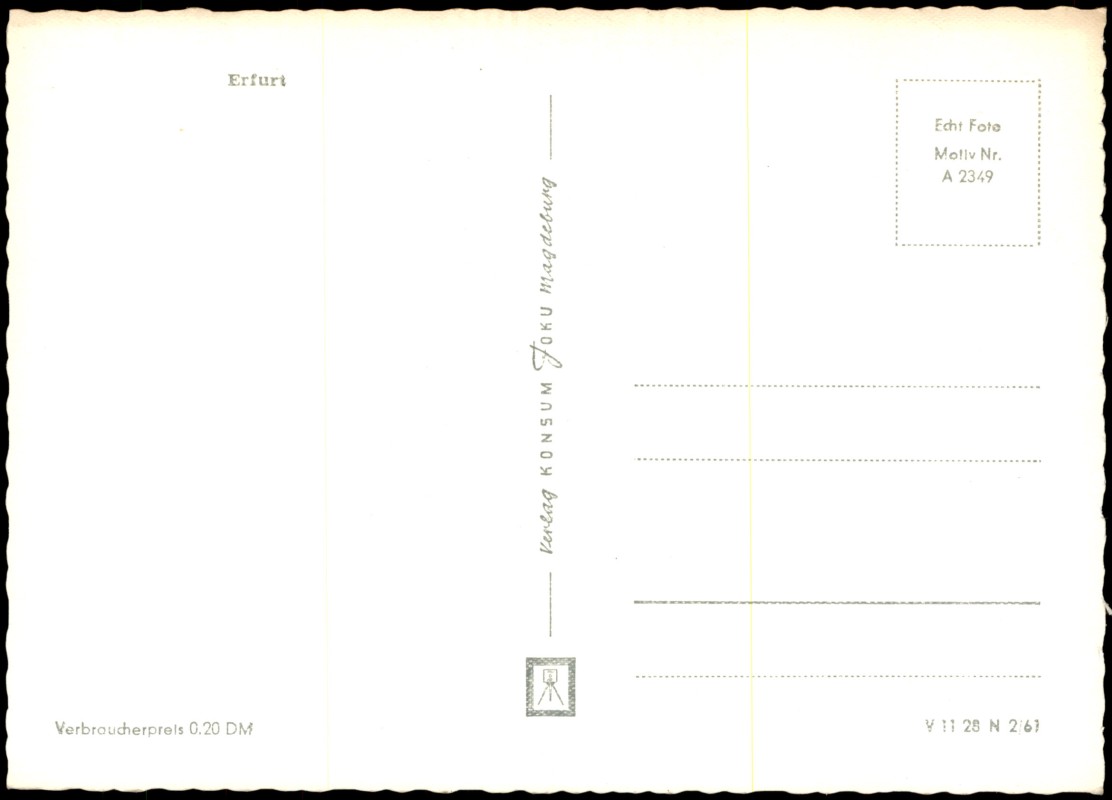 - Echt-Foto-Mehrbildkarte aus Erfurt, bezeichnet als 'Blumenstadt'. Die Karte zeigt vier Einzelmotive: Den Blick vom Stadtpark über die Bahnanlagen, die Regierungsstraße mit dem historischen Regierungsgebäude, das moderne Verwaltungsgebäude der VVB Kali (Vereinigung Volkseigener Betriebe Kali) sowie eine Ansicht der Severikirche. In der Mitte der Komposition ist das Erfurter Stadtwappen (Mainzer Rad) abgebildet. Die Rückseite enthält Verlagsangaben von Konsum Foku Magdeburg und eine Preisangabe von 0,20 DM.