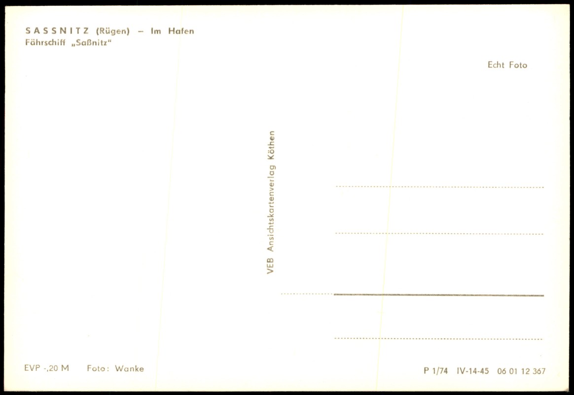 - Echt-Foto-Ansichtskarte aus Sassnitz auf Rügen. Das Bild zeigt das Fährschiff 'Saßnitz' im Hafenbecken. Im Vordergrund fährt ein kleinerer Fischkutter durch das Bild. Im Hintergrund am Hang ist das Rügen-Hotel (ehemals Mitropa-Hotel) deutlich erkennbar. Die Fotografie stammt von Wanke. Die Karte weist den DDR-typischen Preisaufdruck 'EVP -,20 M' auf.
