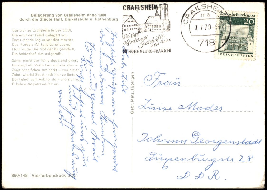- Die Postkarte zeigt eine farbige Illustration der Belagerung von Crailsheim im Jahr 1380 durch die Truppen der Städte Hall, Dinkelsbühl und Rothenburg. Dargestellt ist die berühmte Szene der Stadtsage, in der eine Frau (die 'Horaff') den Belagerern ihr Hinterteil zeigt, um vorzutäuschen, dass die Stadt noch über reichlich Vorräte verfügt. Auf der Rückseite ist ein erklärendes Gedicht zum Ereignis abgedruckt. Die Karte trägt zudem ein Logo des 'Modernen Geschäftszentrums Hohenlohe-Franken'.