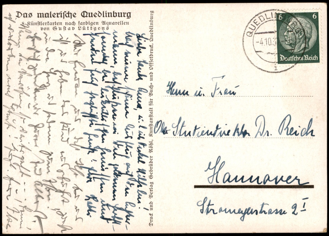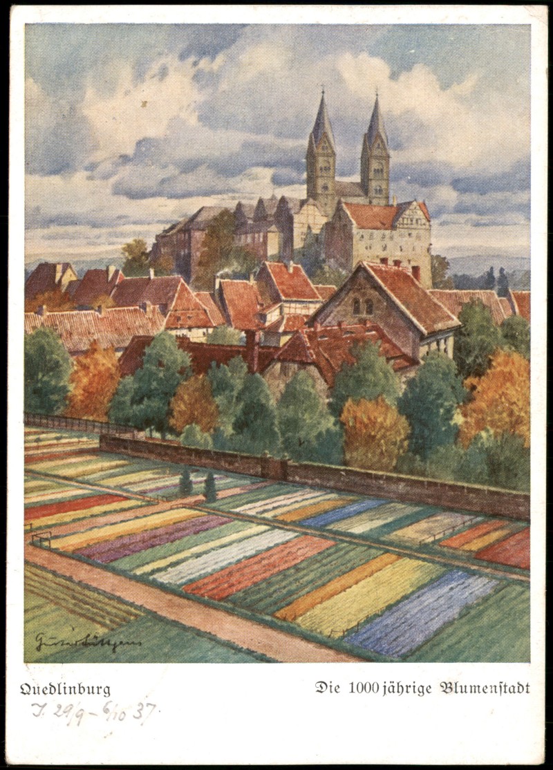 Ansichtskarte: Stadtteilansicht Künstlerkarte nach Aquarell Gustav Lüttgens - Quedlinburg
