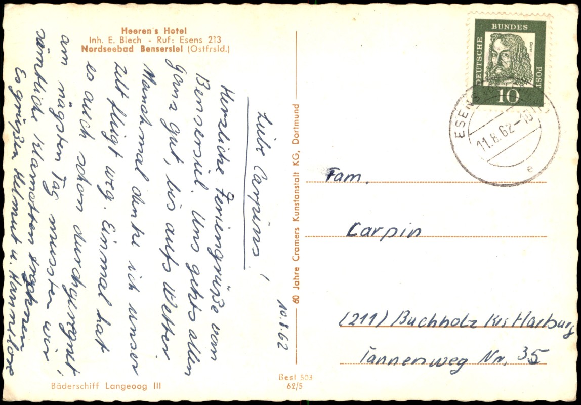 Ansichtskarte: Heeren's Hotel Bäderschiff Langeoog III - Bensersiel-Esens