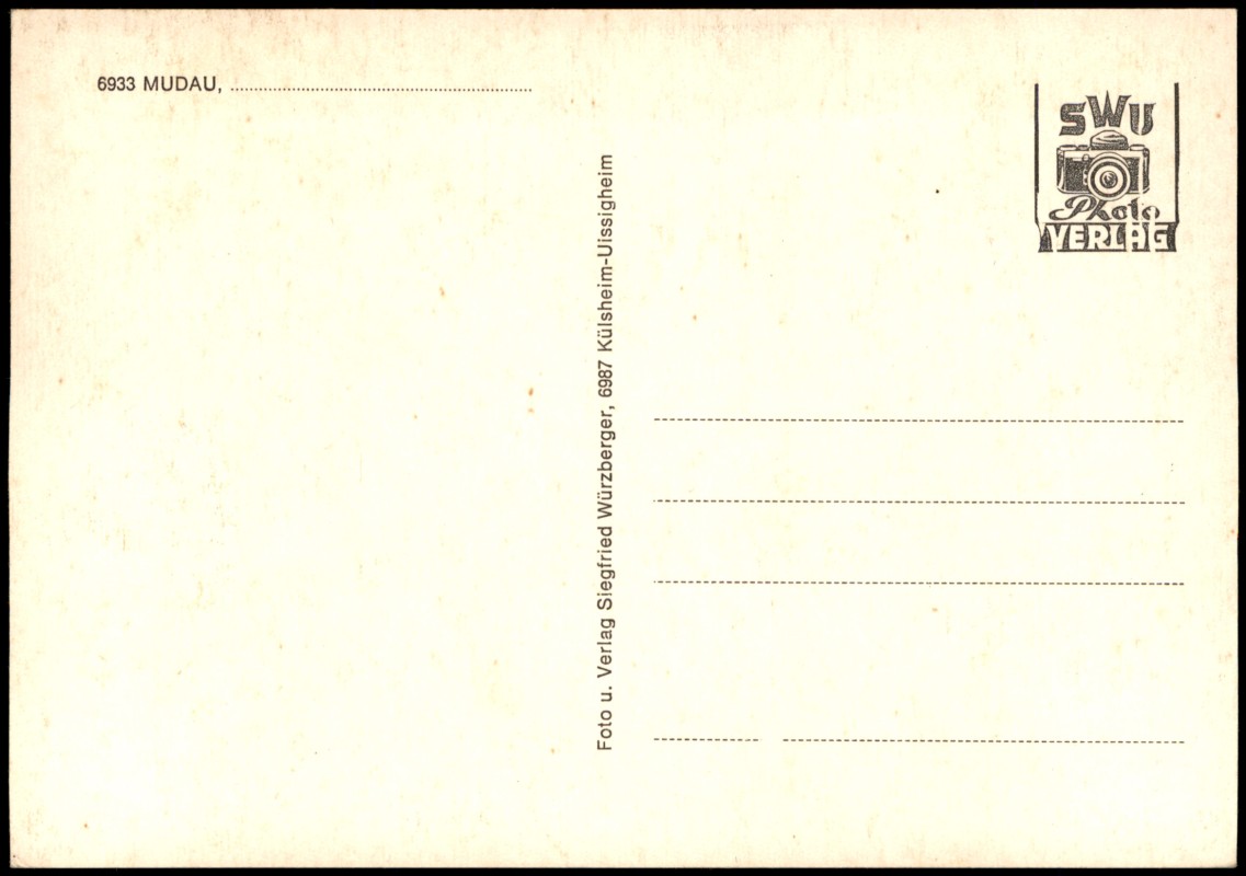 - Farbige Mehrbildkarte aus Mudau im Odenwald mit sechs verschiedenen Ansichten: Odenwaldhalle, die Statue 'Am Bild', ein Denkmal (Pavillon), eine Ortspartie, die Kirche sowie Schloss Waldleiningen. Die Karte wurde vom Foto-Verlag Siegfried Würzberger aus Külsheim-Uissigheim veröffentlicht.