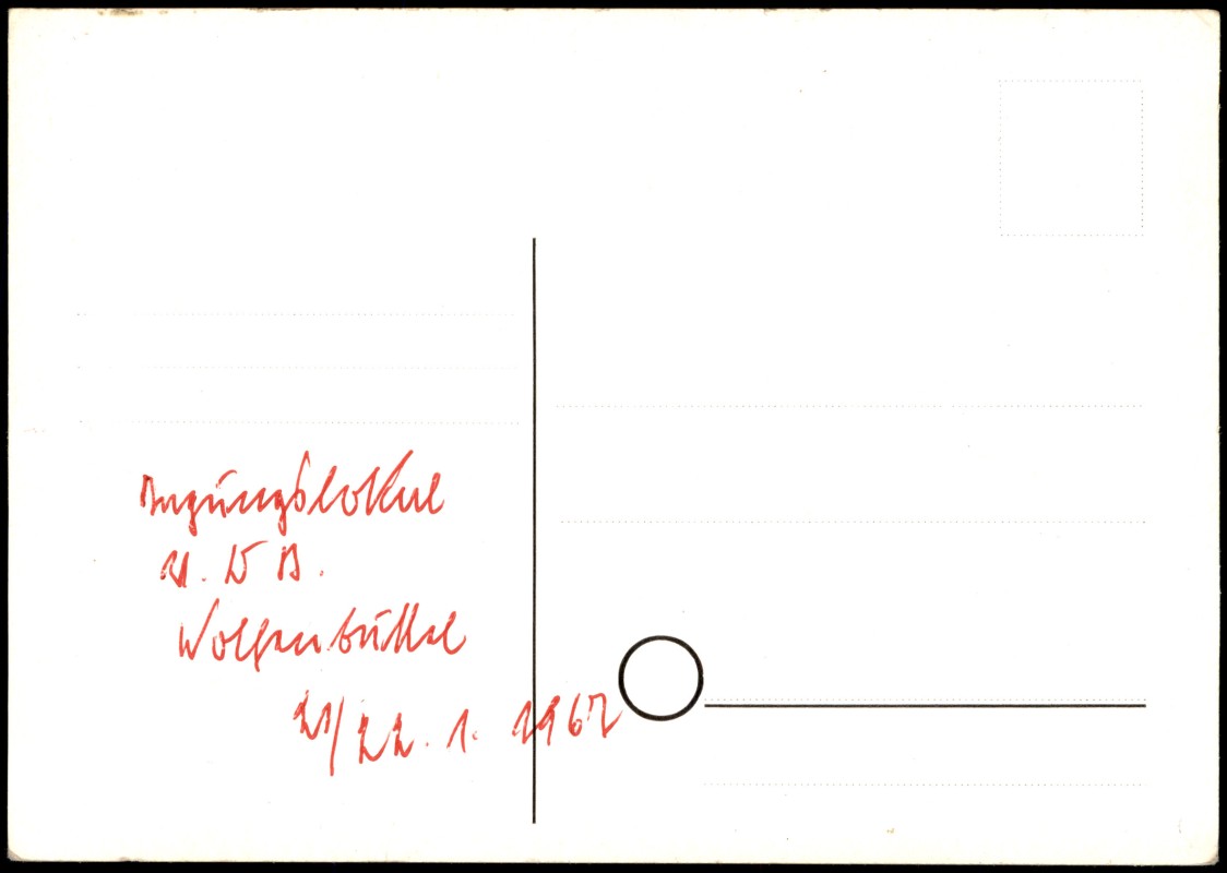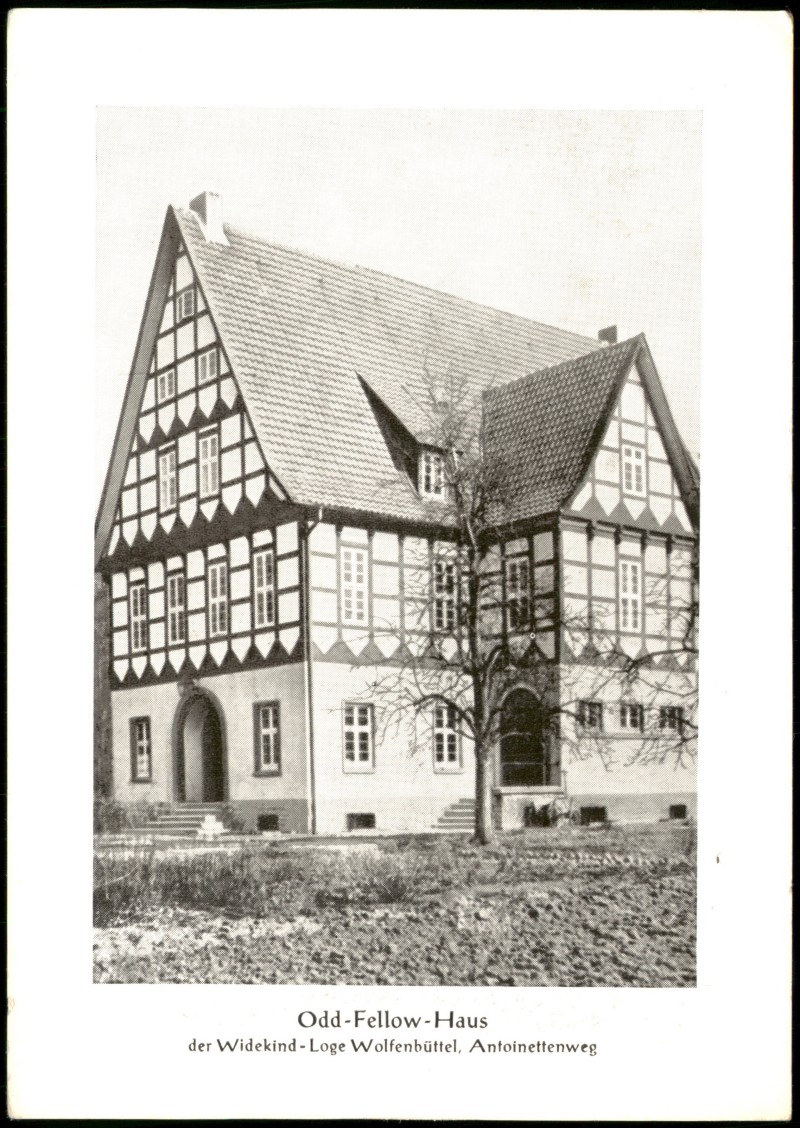 - Die Postkarte zeigt eine Außenansicht des Odd-Fellow-Hauses der Widekind-Loge in Wolfenbüttel am Antoinettenweg. Das Gebäude ist ein repräsentatives Fachwerkhaus mit einem massiven Erdgeschoss und zwei Fachwerkgeschossen unter einem hohen Satteldach.