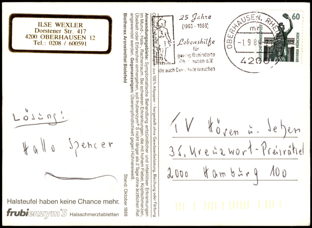 - Werbepostkarte für frubienzym S Halsschmerztabletten. Die Vorderseite zeigt eine farbige Illustration eines roten, gehörnten Wesens ('Halsteufel') in kauernder Haltung neben einer medizinischen Zange. Die Rückseite enthält detaillierte pharmazeutische Angaben zum Produkt (Anwendungsgebiete, Gegenanzeigen) der Firma Biotherax Arzneimittel aus Bielefeld sowie ein Logo zum 25-jährigen Jubiläum der Lebenshilfe Oberhausen e.V.