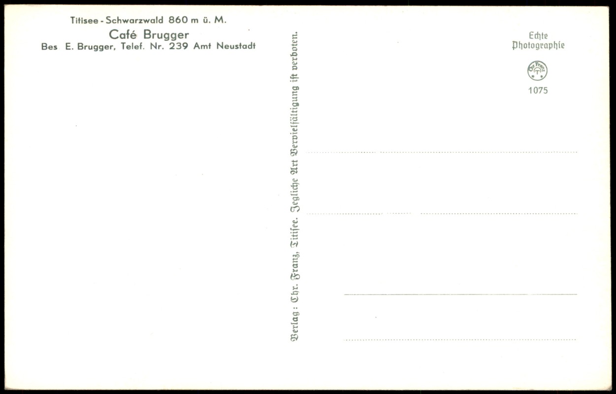 - Echtfoto-Postkarte der Außenterrasse des Café Brugger (Besitzer E. Brugger) am Titisee im Schwarzwald (860 m ü. M.). Die Aufnahme zeigt Gäste an Tischen unter Sonnenschirmen mit einem weiten Blick über den See auf die gegenüberliegenden bewaldeten Berge. Rückseitig ist der Verlag Chr. Franz aus Titisee sowie die Telefonnummer '239 Amt Neustadt' angegeben.