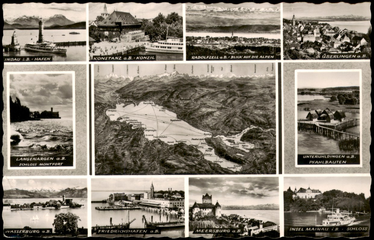 - Mehrbild-AK Bodensee u.a. Relief-Ansicht, Wasserburg, Meersburg, Mainau uvm.
