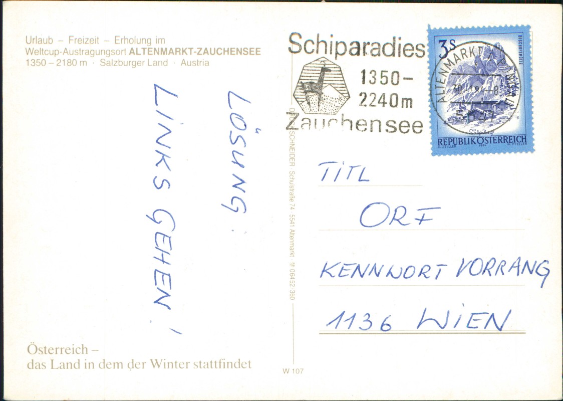 - Vierteilige Ansichtskarte von Zauchensee im Salzburger Land. Die Motive zeigen eine Panoramaansicht des Ortes im Winter, Skifahrer auf einer Piste, die rustikale Garnhofhütte Zauchensee sowie eine gut besuchte Sonnenterrasse einer Skihütte. Die Karte bewirbt den Ort als 'Schiparadies' und Weltcup-Austragungsort Altenmarkt-Zauchensee (1350 - 2180 m).