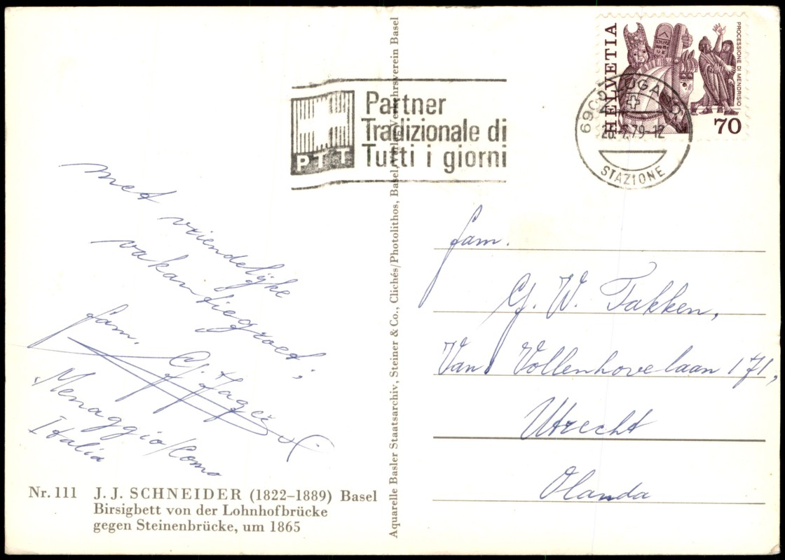 - Reproduktion eines Aquarells von J. J. Schneider (1822-1889), welches das Birsigbett in Basel im Zustand um das Jahr 1865 darstellt. Die Ansicht zeigt den Blick von der Lohnhofbrücke in Richtung Steinenbrücke mit angrenzender historischer Bebauung und Kirchturmspitzen im Hintergrund. Herausgegeben in Zusammenarbeit mit dem Staatsarchiv Basel.