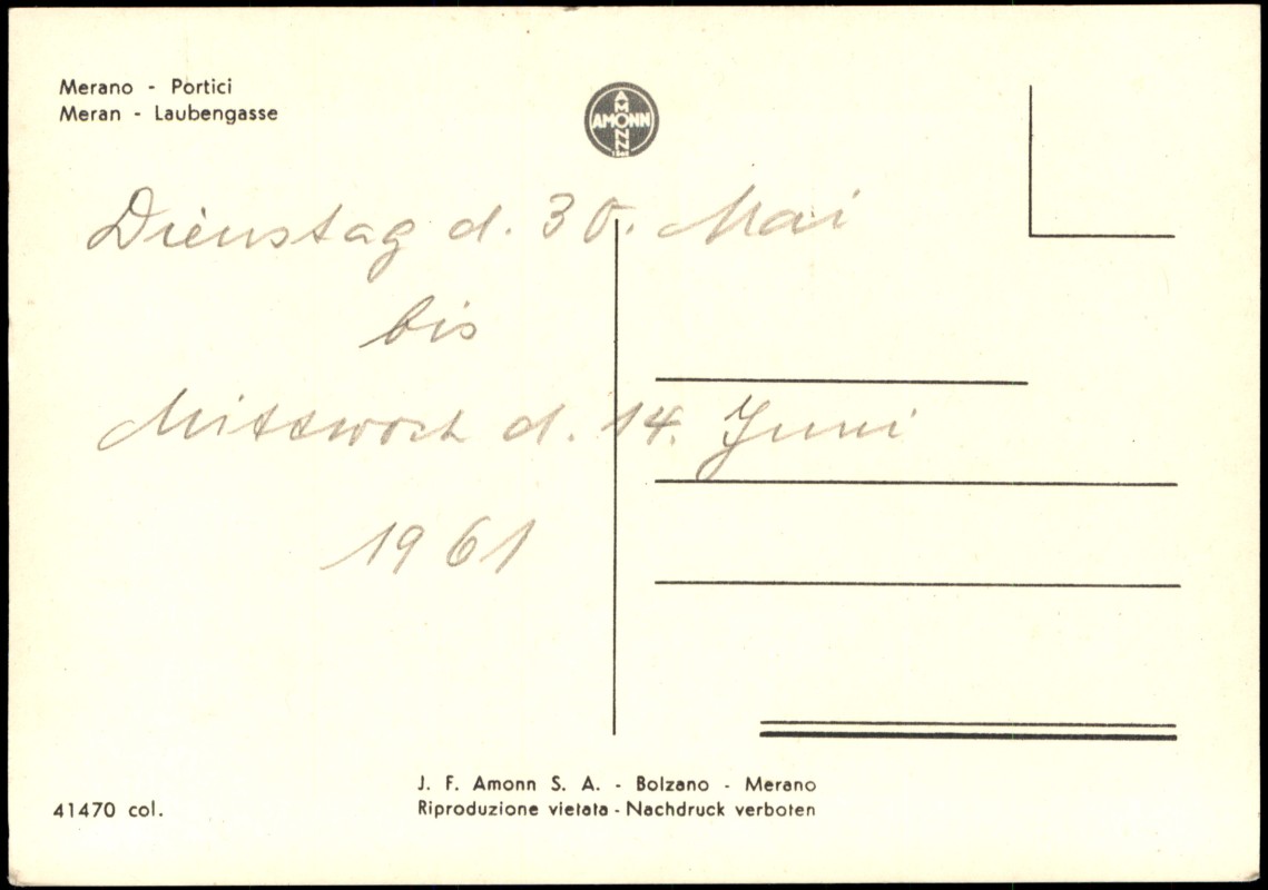 - Blick durch die historische Laubengasse (Portici) in Meran. Die Aufnahme zeigt die charakteristischen Bogengänge, mehrstöckige Gebäude mit Erkern sowie Passanten. Am Straßenrand sind zeitgenössische Fahrzeuge, darunter ein Kleinwagen und ein Motorroller, zu erkennen. Farbfotografie aus dem Verlag J. F. Amonn.