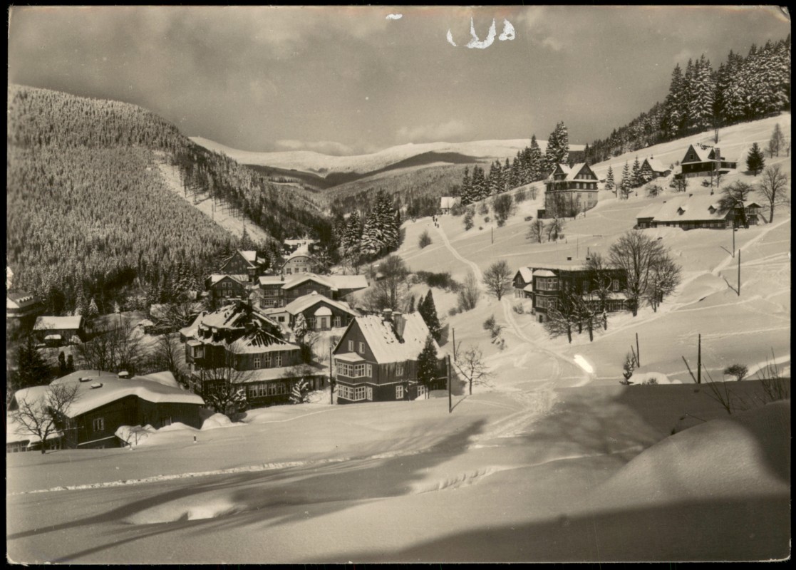 - Schwarz-Weiß-Fotografie einer winterlichen Gebirgslandschaft in Špindlerův Mlýn (Spindlermühle) im Riesengebirge (Krkonoše). Zu sehen sind verschneite Hänge und alpine Gebäude, darunter das Hotel Sněžka sowie verschiedene Erholungsheime (zotavovny).