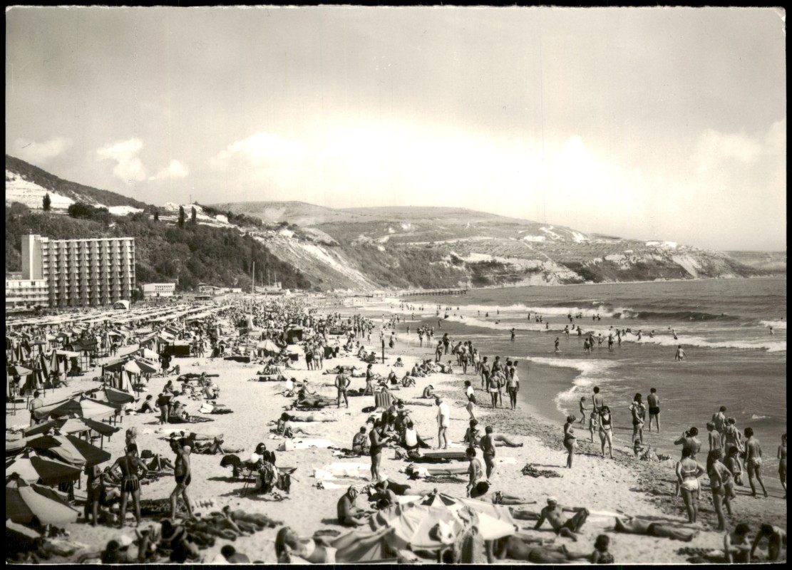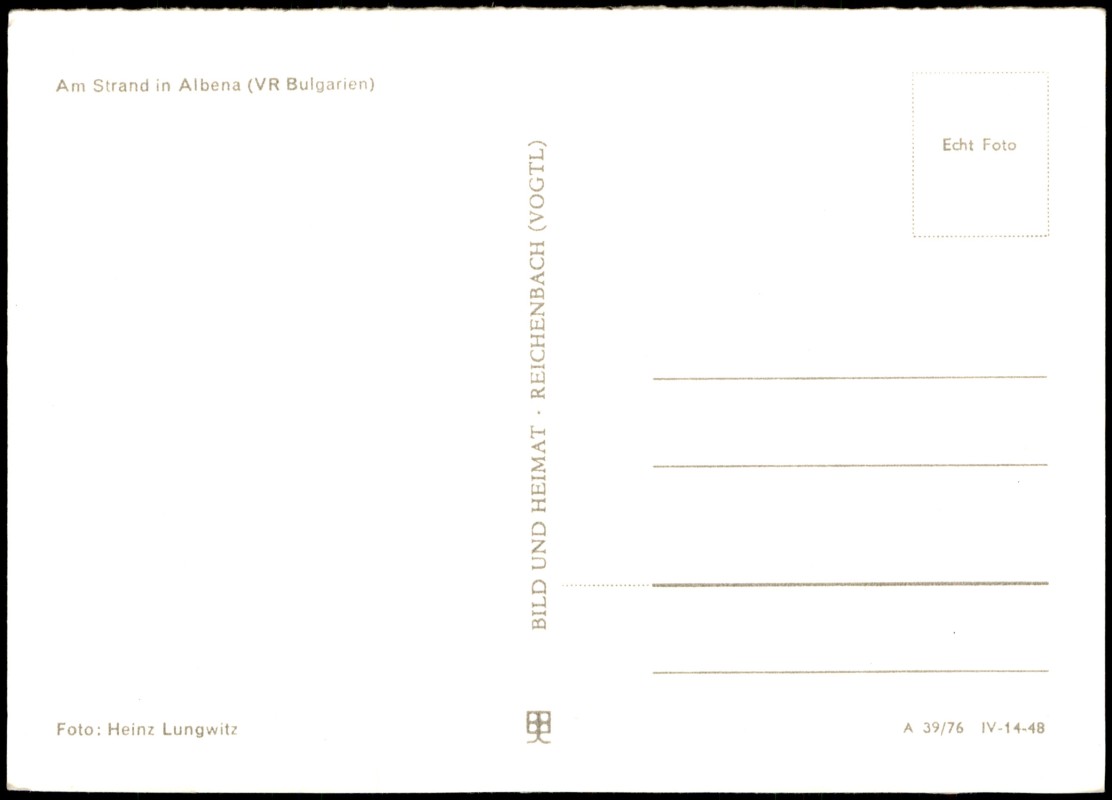- Schwarz-weiß-Fotografie des belebten Badestrandes im bulgarischen Seebad Albena (damals VR Bulgarien). Zu sehen sind zahlreiche Urlauber, Sonnenschirme und im Hintergrund ein markanter, terrassenförmiger Hotelbau sowie die angrenzende Hügellandschaft. Die Aufnahme stammt vom Fotografen Heinz Lungwitz. Die Karte wurde im Verlag Bild und Heimat Reichenbach (Vogtl) produziert.