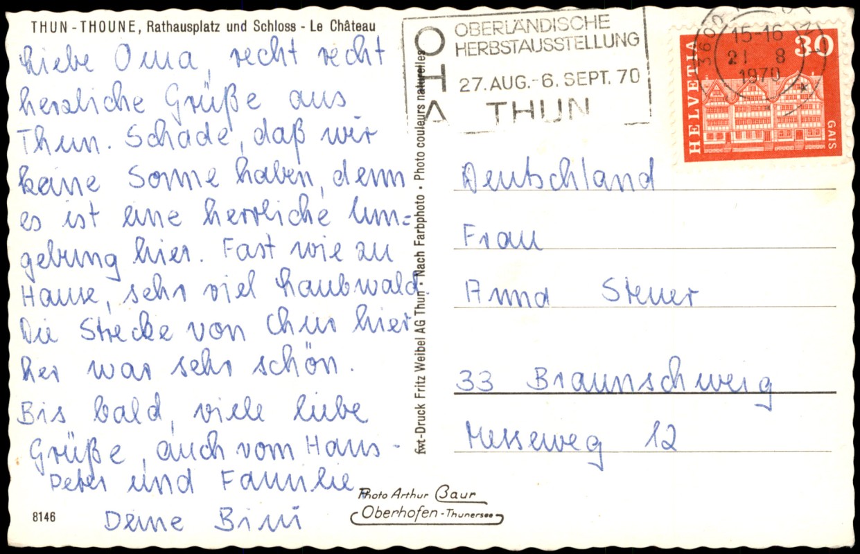 - Farbige Ansichtskarte von Thun, Schweiz, mit Blick auf den Rathausplatz und das imposante Schloss Thun (Le Château) im Hintergrund. Die Szene zeigt eine belebte Straße mit historischen Gebäuden, darunter eines mit den Aufschriften 'CINZANO', 'COIFFEUR', 'RESTAURANT' und 'STUBLE'. Mehrere klassische Automobile sind auf dem Platz geparkt. Die Karte wurde von Photo Arthur Baur aus Oberhofen-Thunersee fotografiert und von fwt-Druck Fritz Weibel AG Thun gedruckt. Seriennummer 8146.