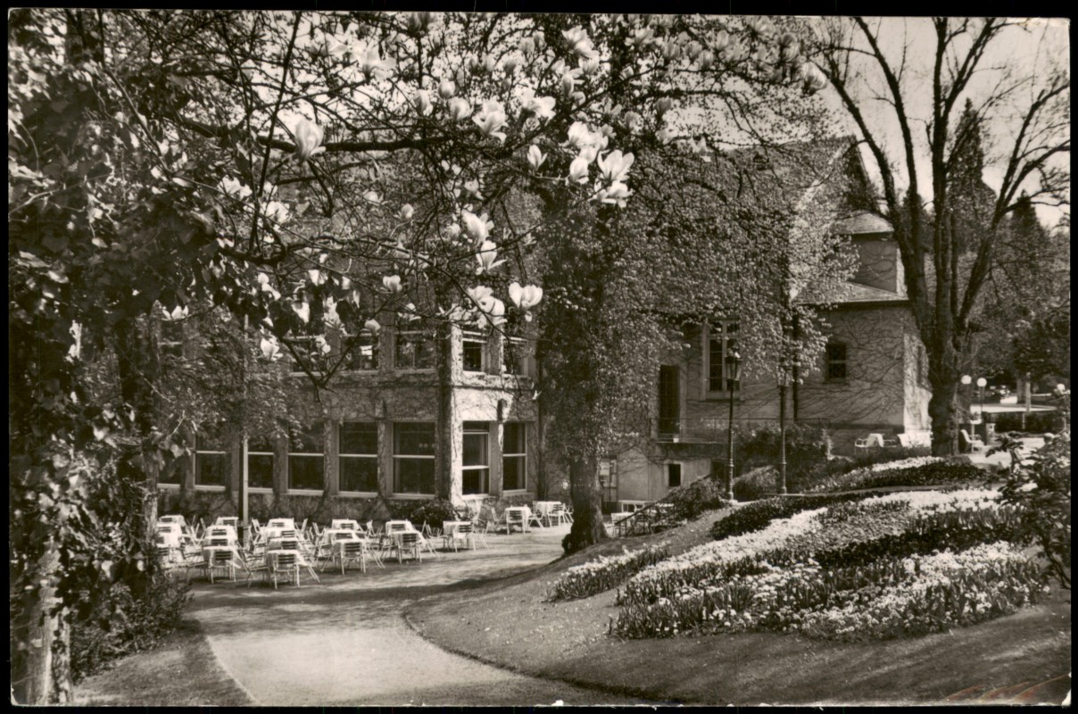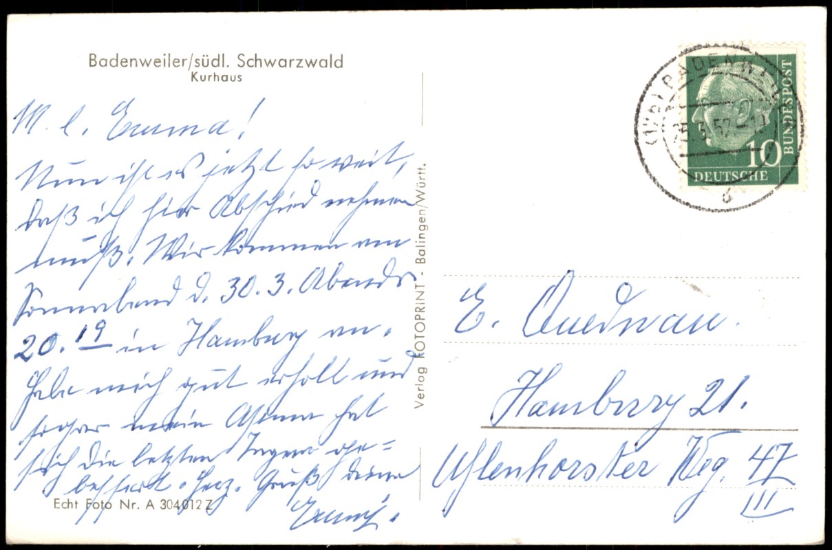 - Die Postkarte zeigt das Kurhaus in Badenweiler, gelegen im südlichen Schwarzwald. Das Gebäude ist von einem gepflegten Kurpark umgeben, der mit blühenden Pflanzen und Bäumen gestaltet ist. Vor dem Kurhaus befindet sich eine Terrasse mit zahlreichen Tischen und Stühlen, die auf eine Nutzung als Café oder Restaurant hindeutet. Die Karte ist als 'Echt Foto' vom Verlag FOTOPRINT aus Balingen/Württ. mit der Seriennummer A 3040127 gekennzeichnet.