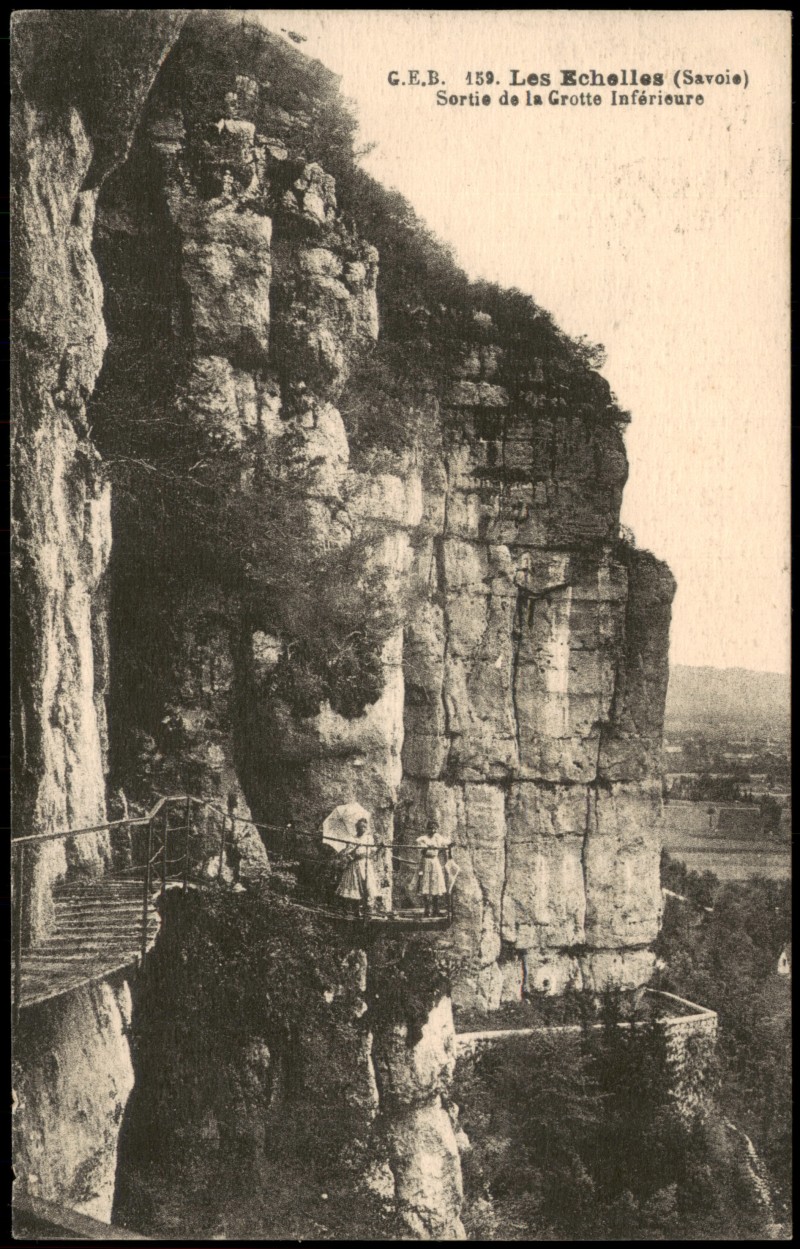 - Ansicht der 'Sortie de la Grotte Inférieure' (Ausgang der unteren Grotte) in Les Echelles, Savoie. Die Karte zeigt eine beeindruckende Felswand mit einem in den Fels gehauenen Weg und Treppen, die aus dem Höhleneingang führen. Mehrere Personen sind auf dem Weg zu sehen, eine davon mit einem Sonnenschirm. Die Karte trägt die Bezeichnung 'G.E.B. 159.' auf der Vorderseite und 'THIRIA 419' sowie den Verlagsstempel 'EDITION A. THIRIA VOIRON' auf der Rückseite. Sie ist Teil der Serie 'PERLE DES ALPES'.