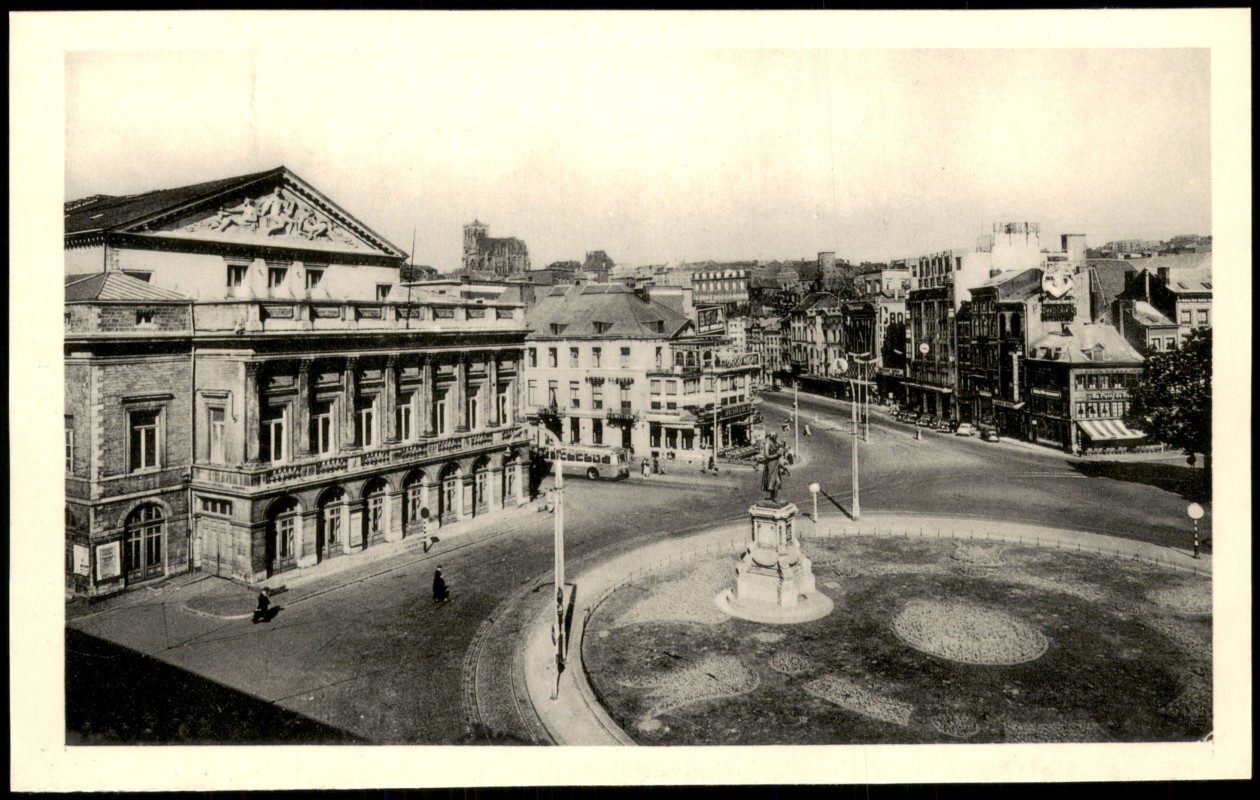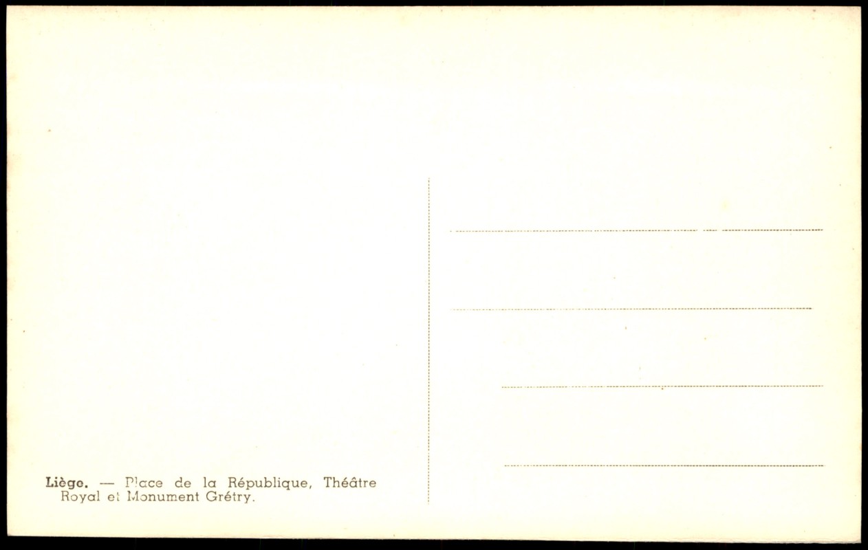 - Historische Ansicht der Place de la République in Liège (Lüttich). Im Vordergrund ist das Monument Grétry in der Mitte des Platzes zu sehen. Links dominiert das imposante Gebäude des Théâtre Royal die Szene. Im Hintergrund sind weitere Gebäude und die belebte Stadtlandschaft erkennbar. Die Karte zeigt eine typische Straßenszene der Zeit mit wenigen Passanten und dem Charme einer frühen Postkarte.