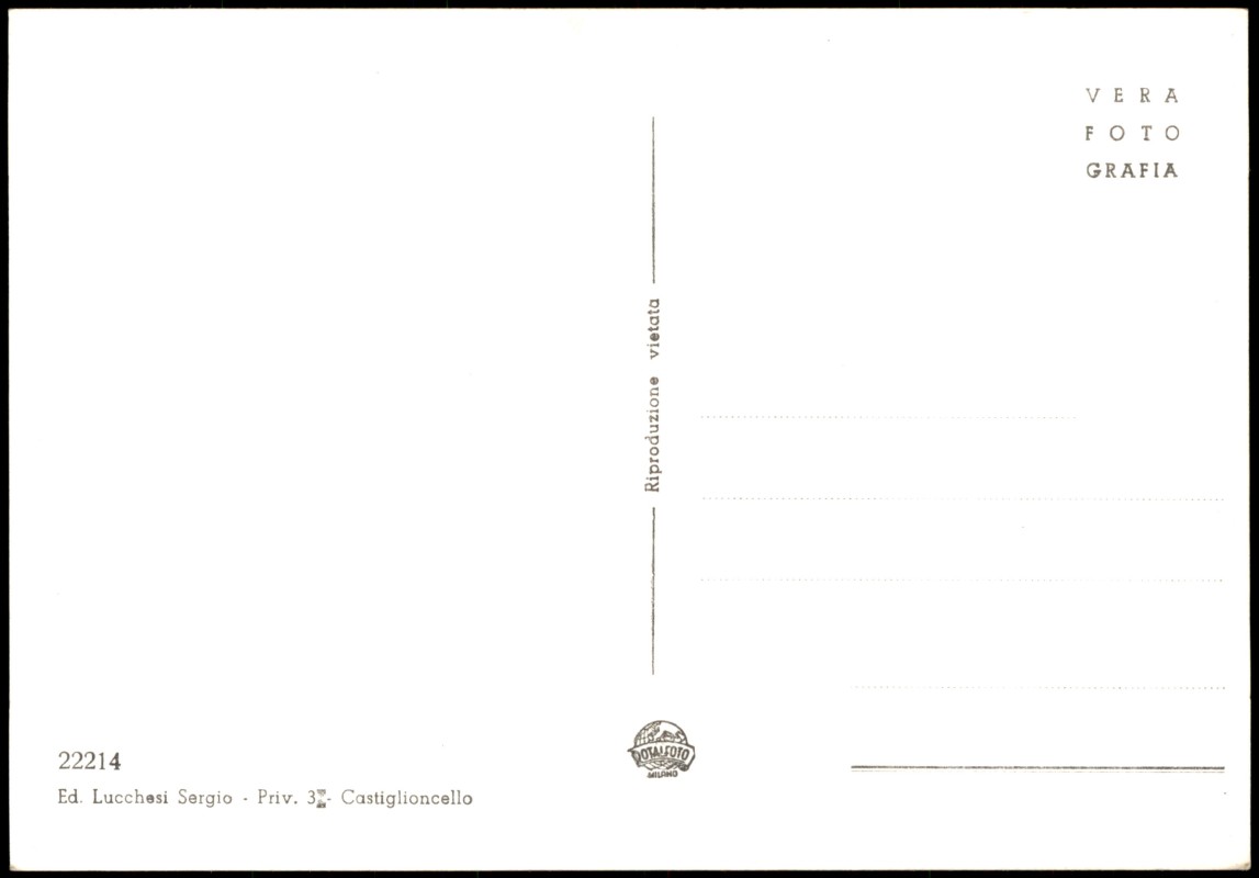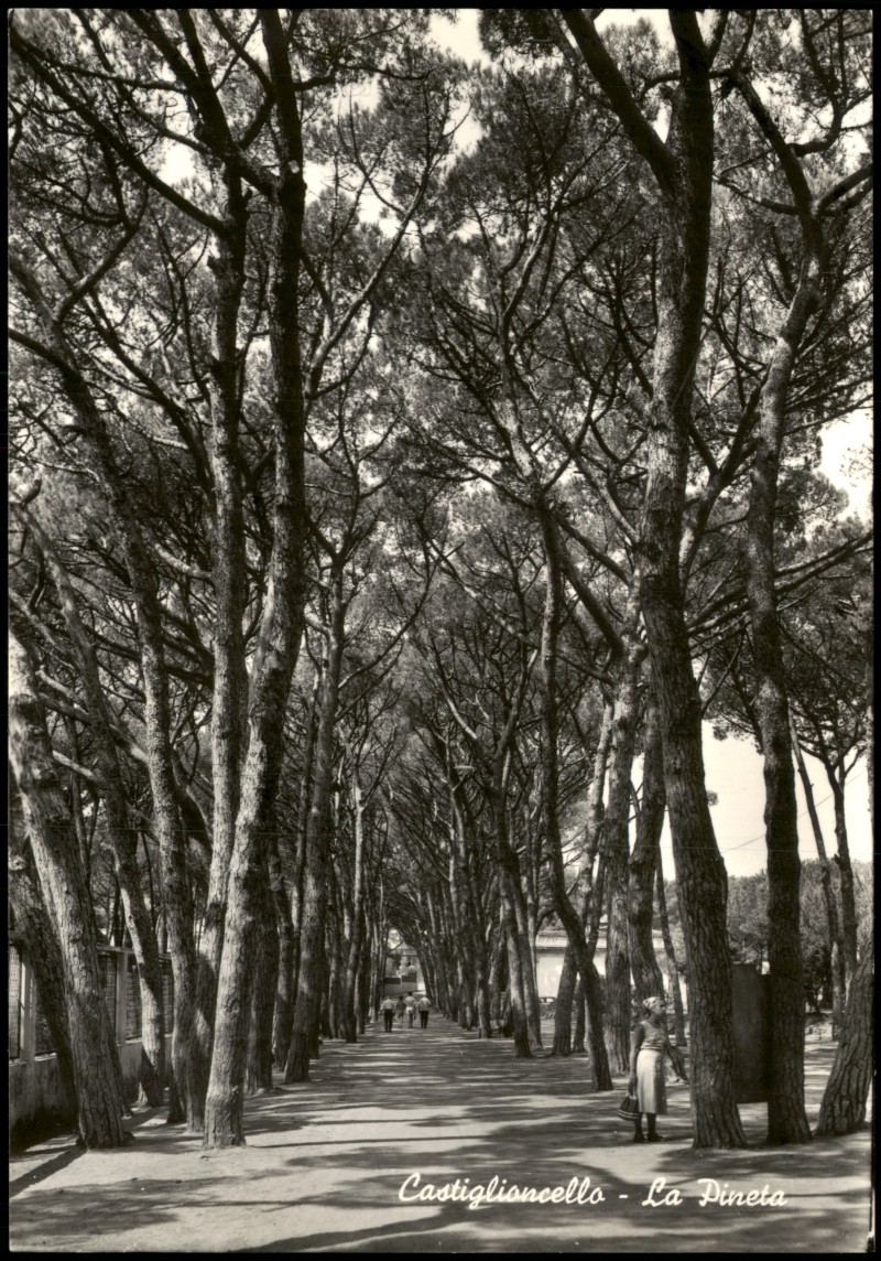 - Echtfoto-Postkarte (Vera Fotografia) mit einer Ansicht der 'Pineta' in Castiglioncello. Das Motiv zeigt einen von hohen Pinien gesäumten Weg mit Spaziergängern im Hintergrund. Herausgegeben von Rotalfoto Milano unter der Edition Lucchesi Sergio, Seriennummer 22214.